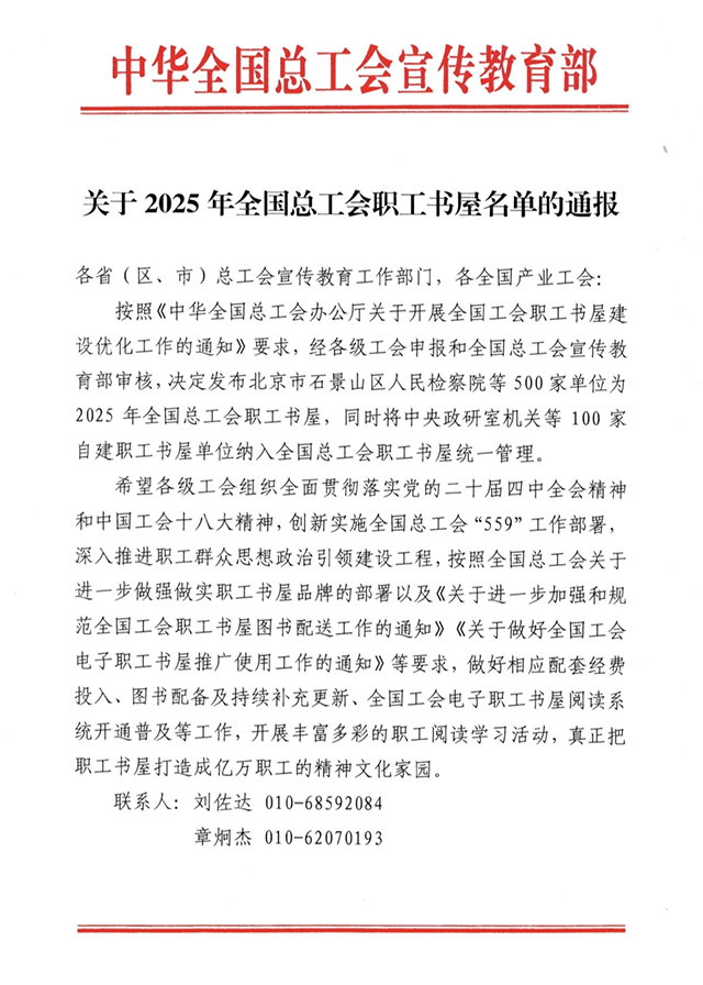 此次荣获“全国总工会职工书屋”称号,是对公司长期以来致力于提升职工文化素养、构建和谐劳动关系的充分肯定。公司将以此为契机,进一步发挥职工书屋在思想教育、业务培训、素质提升等方面的文化功能和阵地作用,不断提升书屋的建设品质与综合服务能力。(撰稿:胡琼)